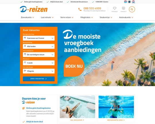 Inmiddels is D-Reizen weer volop in bedrijf en hebben ze weer volop boekingen. Dit komt omdat D-Reizen vele voordelen heeft voor de consument bij het aanbieden van reizen. Een aantal voordelen van D-Reizen zijn: • D-Reizen bezit tussen de 100 en 150 reisbureaus door heel Nederland. Hierdoor is het voor de consument erg makkelijk om een reis te boeken. Voor de consument die liever niet via het internet koopt, zijn de reisbureaus ’s ideaal. De reisagenten die werkzaam zijn in de reisbureaus hebben allemaal een passie voor reizen, die ze graag met jou delen. Doordat ze allen een passie hebben voor het reizen, kunnen ze jou ook de leukste vakanties adviseren. De reisagenten zullen er alles aan doen, om te zorgen dat jij de vakantie vindt, die jij hoopt te vinden. • De bereikbaarheid van D-Reizen is erg ruim. Na ruim 50 jaar is D-Reizen de grootste onafhankelijke reisorganisatie van Nederland. D-Reizen heeft ruim 4 miljoen klanten, waardoor de ervaring ook flink aanwezig is. Door hun grote aanbod aan reizen kunnen ze ook scherpe prijzen aan de consument aanbieden. De bereikbaarheid is niet enkel groot in de reisbureaus. De bereikbaarheid is ook erg ruim qua telefoon, email en social media. Bij deze contactmogelijkheden kan je vragen stellen over al je denkbare vakantievragen. • Je zoekt niet urenlang voor de beste deal op het internet. Bij D-Reizen hebben ze namelijk de beste deals gevonden voor jou. Je hoeft dus zelf niet meer te zoeken, dit heeft D-Reizen al gedaan voor je. Met één zoekopdracht zie jij direct een overzicht van alle vakanties die aangeboden worden door de grote touroperators. Vergelijken hoef je dus vanaf nu niet meer te doen. Wil je het zoeken ook helemaal uitbesteden? Maak dan een afspraak met een persoonlijke reisadviseur in één reisbureau in je omgeving. Wil je liever niet in een van de reisbureaus langsgaan? Dan kan je ook een persoonlijk advies krijgen via de contactmogelijkheden die hierboven zijn besproken. Een ander voordeel is dat D-Reizen tijdens jouw vakantie een vast aanspreekpunt is. Ervaar je problemen of heb je bij iets anders hulp nodig? Je kunt dan contact opnemen met de reisagent in jouw buurt die jou direct zal helpen. • D-Reizen heeft een erg groot aanbod aan reizen. Of je nu op zoek bent naar een strandvakantie, een weekendje weg of een verre reis, bij D-Reizen kan je het vinden. Je kan bij de reizen ook kiezen uit verschillende vervoersmiddels. Wil je liever met het vliegtuig of met de auto? Alles is mogelijk. Wil je met het vliegtuig en in het land van aankomst een auto huren? Ook hierbij helpt D-Reizen je graag. D-Reizen neemt je alles uit handen zodat jij alleen nog maar hoeft te genieten van jouw vakantie. • Bij D-Reizen kan je genieten van de inspiratieavonden die georganiseerd worden in de buurt van jouw dichtbij zijnde reisbureau. Tijdens deze inspiratieavonden kom jij op de leukste ideeën voor je bestemming. De inspiratieavonden zijn allemaal gratis en toegankelijk voor iedereen die interesse heeft. De specialisten van D-Reizen nemen jou me in bepaalde thema’s. Bij deze thema’s word je meegenomen door middel van woorden en beelden voor je eventuele toekomstige reis. De inspiratieavonden zijn allemaal voorzien van een lekker hapje en drankje, waarbij jij al je vragen kan stellen aan de aanwezige reisagenten.